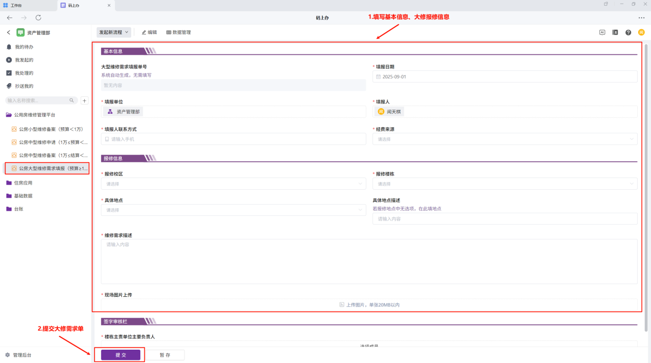 各单位若有公房大型维修需求,由楼栋主责单位负责牵头在“公用房维修管理平台/公房大型维修需求填报”提交需求单,资产管理部负责收集汇总提出维修需求,会同校园建设部提出下一年初步维修计划,校园建设部负责组织项目论证并制定维修计划、申报预算、组织实施等。公用房大型维修需求填报操作页面如下图所示。