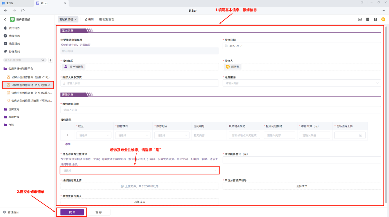 中型维修采用“审核制”,需经资产管理部及相关归口部门审核维修项目的必要性、可行性后才可实施,预算下达至各公用房授权管理单位。授权管理单位收集和汇总需求后,在“公用房维修管理平台/公房中型维修申请”提交中型维修申请,操作页面如下图所示。