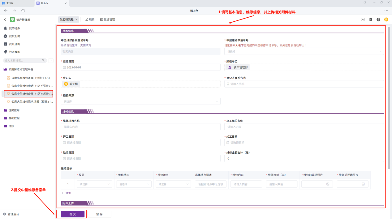 各单位公房中型维修项目结算完成后,需在“公用房维修管理平台/公房中型维修申请”提交中型维修备案单,操作页面如下图所示。