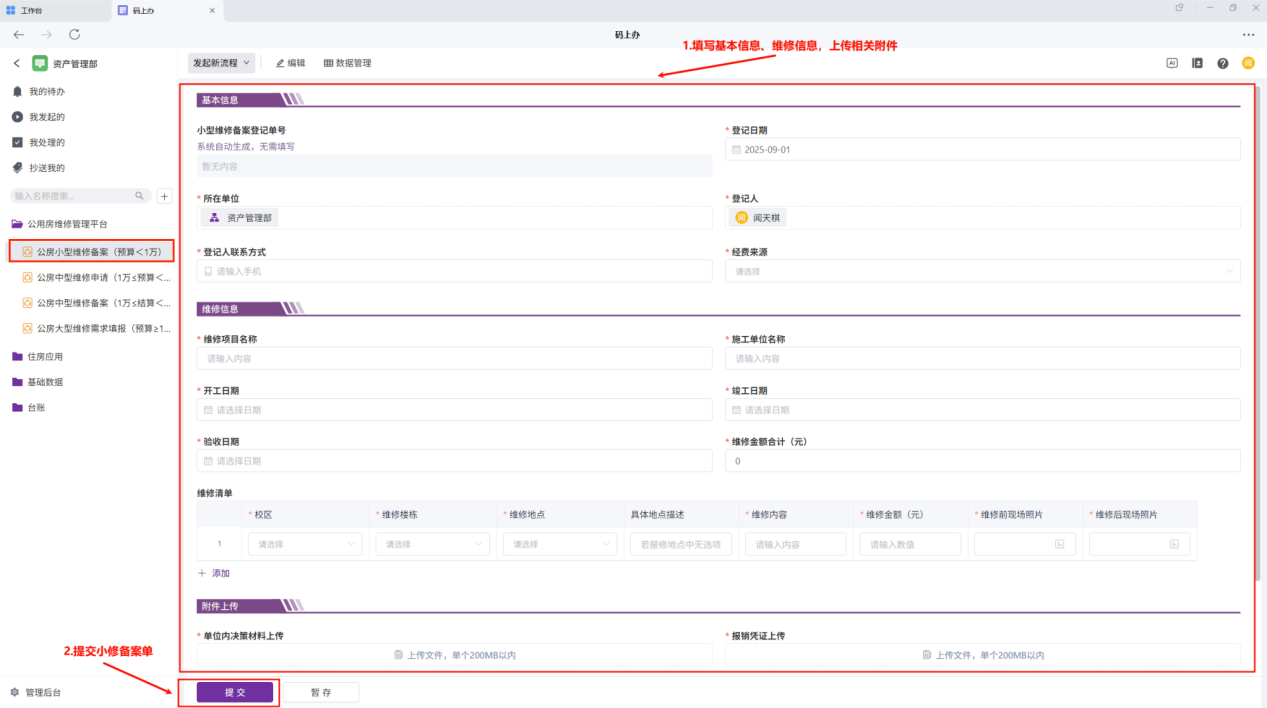 小型维修采用“备案制”,各授权管理单位自行组织实施,预算下达至各公用房授权管理单位。维修结算完成后,授权管理单位定期在学校“公用房维修管理平台/公房小型维修备案”进行小型维修事项备案,操作页面如下图所示。